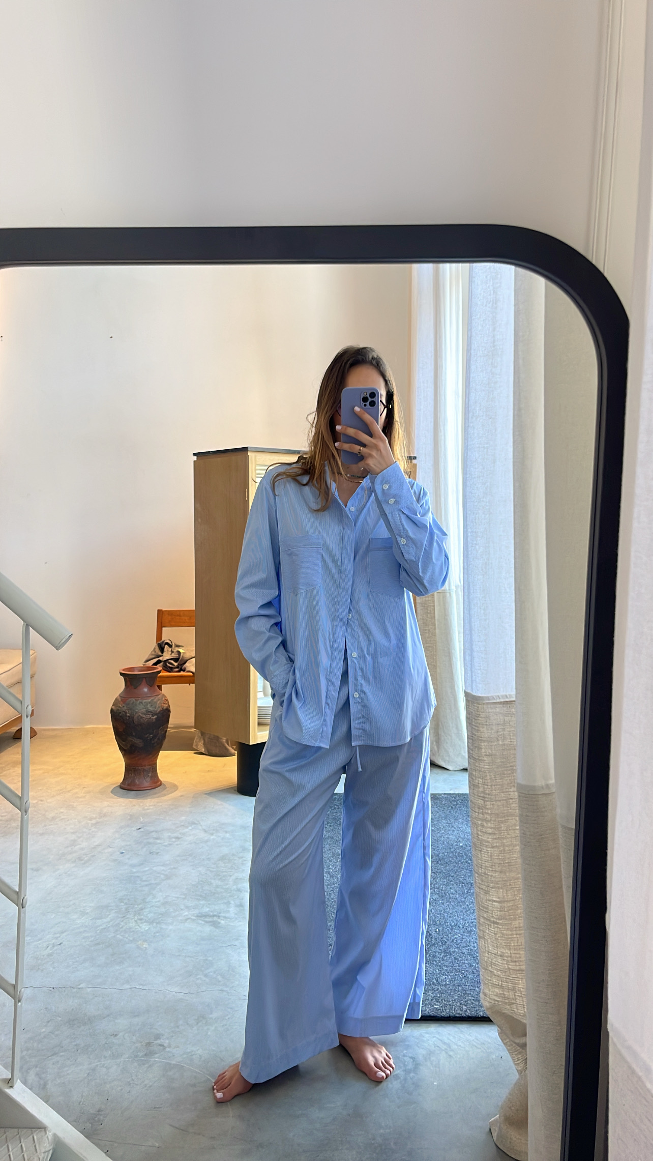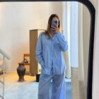 The structured neck linen dress – Light Blue Striped